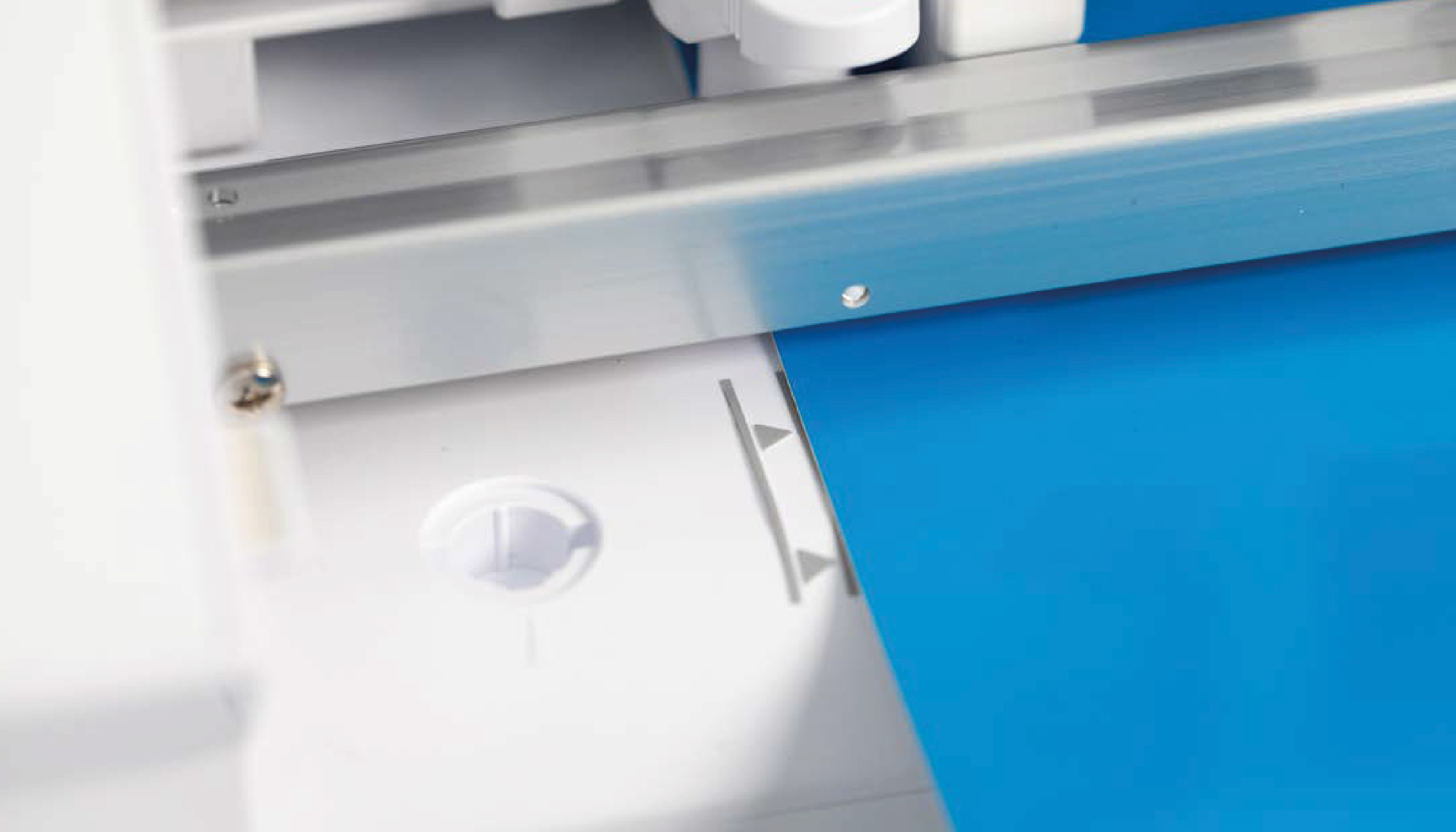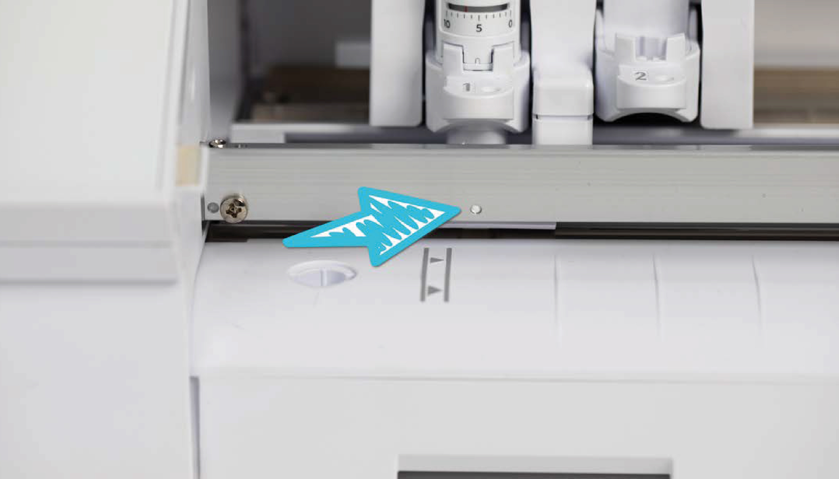 - Verifica que los rodillos en la barra de rodillos estén configurados correctamente con las guías adecuadas en la máquina. Al cortar medios amplios, el rodillo de presión de plástico debe alinearse con la flecha central en la máquina, como se ve en la imagen a la derecha.
