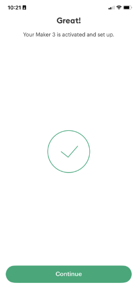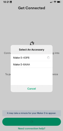 4. Cuando se complete la actualización, su máquina se apagará y volverá a encenderse automáticamente, y se le pedirá que seleccione un accesorio. Espere a que su máquina aparezca en la lista, toque su máquina para seleccionarla. La aplicación tardará varios momentos en conectarse a tu máquina de nuevo, luego aparecerá un círculo verde con una marca de verificación que indicará que la actualización o activación se ha realizado correctamente.